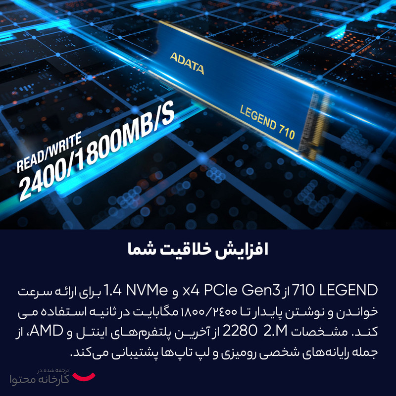 SSD LEGEND 710 با بهرهمندی از استاندارد PCIe Gen3 x4 و NVMe 1.4، سرعت پایدار 2400/1800 مگابایت بر ثانیه را برای خواندن و نوشتن اطلاعات ارائه میدهد که در نوع خود بینظیر است. همچنین طراحی SSD جدید ای دیتا از نوع M.2 2280 بوده تا با جدیدترین پلتفرمهای اینتل و AMD برای استفاده در انواع کامپیوتر و لپ تاپ سازگار باشد. طراحی ساده اما ظریف هیت سینک LEGEND 710 به همراه استفاده از رنگ آبی و برنزی در طراحی آن، زیبایی چشمگیری را خلق کرده است. این هیت سینک میتواند دمای کارکرد SSD را تا 15% پایینتر بیاورد. ضخامت این هیت سینک به حدی کم است که حتی در لپتاپ نیز قابل استفاده است.