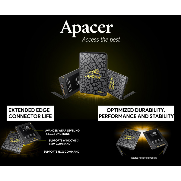 اس اس دی «AS340 PANTHER» محصولی از برند «اپیسر» (Apacer) است. این درایو اس اس دی در فرم فاکتور 2.5 اینچی ساخته شده و دارای ظرفیت 240 گیگابایت است. سطح جلویی محصول با استفاده از الگوی سنگی زیبایی تزیین شده و کاری کرده تا بتوانید از AS340 PANTHER به عنوان یک ذخیرهساز اکسترنال هم استفاده کنید. در این حافظه SSD از تراشههای TLC NAND استفاده شده تا هزینهی نهایی محصول کاهش پیدا کند. TLC ها از نظر کیفیت و سرعت، پایینتر از SLC و MLC قرار میگیرند و از هارددیسکهای سنتی سریعتر و باکیفیتتر هستند. رابط اتصال این حافظه از نوع SATA 3.0 است و حداکثر سرعت انتقال آن در حالت اسمی 6 گیگابیت بر ثانیه است. در عمل، سرعت خواندن 505 مگابایت بر ثانیه و سرعت نوشتن 410 مگابایت بر ثانیه را از این محصول دریافت خواهید کرد. روی رابط SATA و پورت برق با استفاده از یک درپوش پوشانده شده تا در صورت استفاده از محصول به صورت اکسترنال، گرد و خاک وارد پورتها نشوند. پشتیبانی از دستورات TRIM و NCQ که جزو قابلیتهای استاندارد اس اس دیها هستند، در این محصول هم وجود دارند. پشتیبانی از دستورالعملهای S.M.A.R.T دیگر قابلیت موجود در AS340 PANTHER است. مدیریت بهینهی مصرف انرژی و در اختیار داشتن موتور پیشرفته کدهای اصلاح خطا (ECC) از مشخصههای قابل توجه این اس اس دی به شمار میآیند. این حافظه دارای عمر خوبی است و حداقل 1.5 میلیون ساعت طول میکشد تا خطایی در روند خواندن و نوشتن دادهها در آن رخ دهد. این مشخصه که به MTBF معروف است، مشخص میکند که بین هر دو خطای خواندن و نوشتن، چقدر فاصلهی زمانی میافتد. همراه با محصول، یک براکت تبدیل 2.5 اینچ به 3.5 اینچ ارائه میشود تا بتوانید از آن در کیسهای فاقد سینی 2.5 اینچی هم استفاده کنید.
